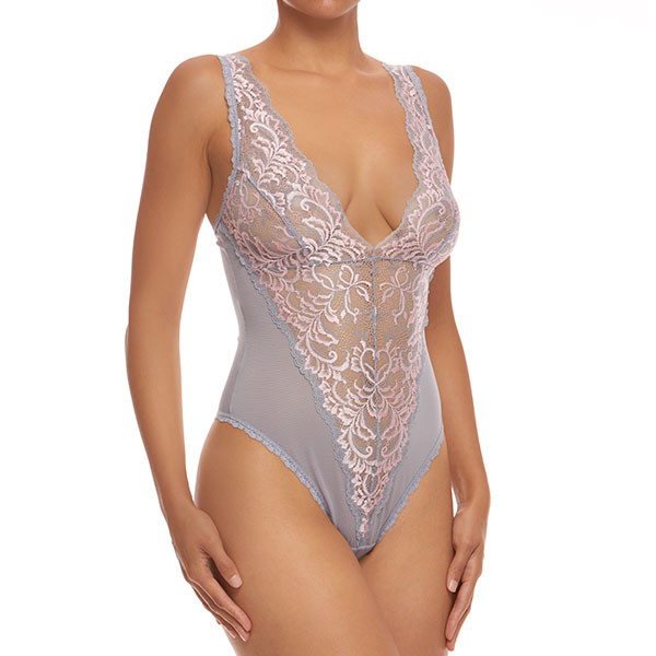 Bodi Frau in raffinierter zweifarbiger Spitze, pink und hellgrau.