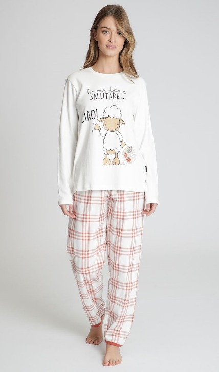 Kompletter Damenpyjama mit Rundhalspullover, weiße Farbe, mit zentralem Aufdruck.