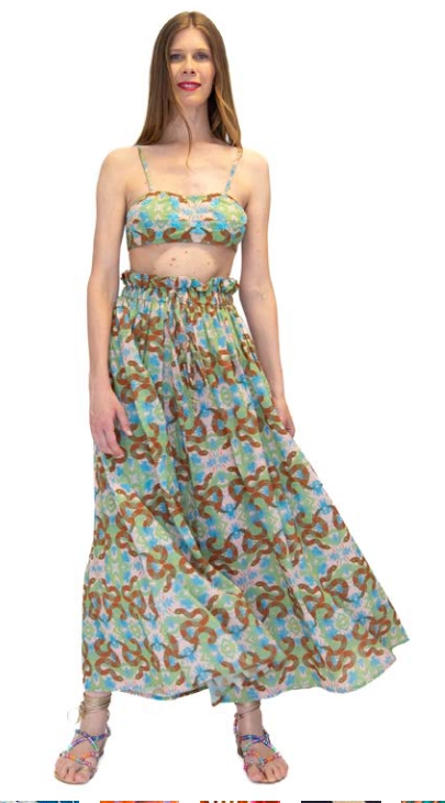 Gonna lunga fino alle caviglie, elasticata in vita, con coulisse, e mappetti di perline finali.
