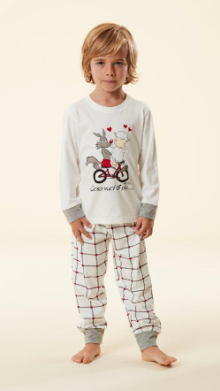 Happy People, complete pajamas for boys. Ivory sweater with design on the front, round neck, long sleeves with gray cuff. Long ivory checkered trousers, with ankle cuff. Composition 100% cotton. Spring summer season