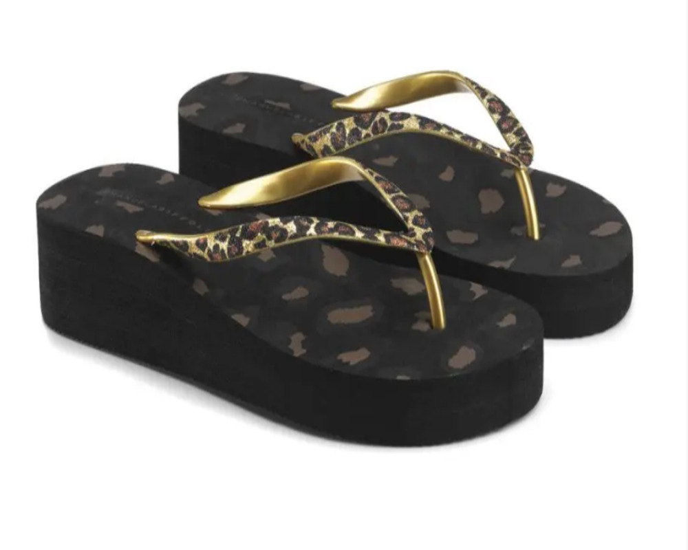 Infradito Biffoli, infradito zeppa con motivo animalier su sfondo nero. I lacci sono decorati da glitter oro stampati. Ciabattina unica e grintosa per essere sempre in tendenza.