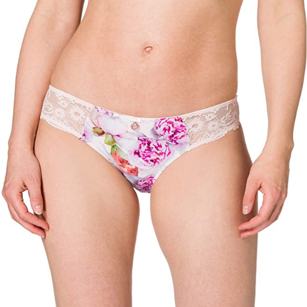 Slip rosa, con  fantasia floreale, medaglietta logata sulla parte anteriore, e morbidissimo pizzo sui fianchi.