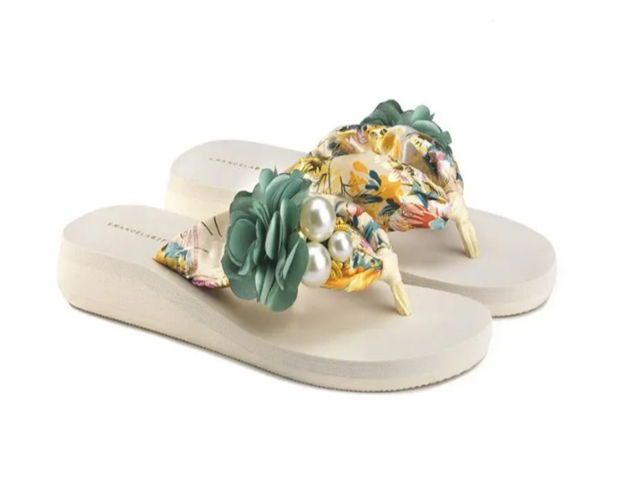 Chanclas de cuña biffoli, con tela flor y perlas, color marfil, cordones foulard estampados, suela que adelgaza la figura y garantiza una gran comodidad.