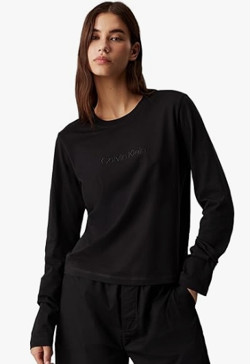 Camiseta de mujer de cuello redondo y manga larga con logo bordado en la parte central, color negro.