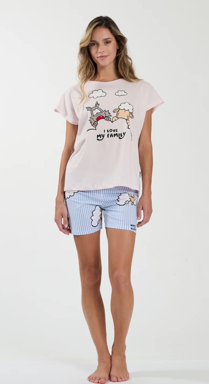 Il tessuto a righe azzurre è arricchito dal disegno fantasia della linea Love My Family, per un look delicato e armonioso. Maglia girocollo a manica corta 100% cotone, morbido e traspirante Disegno fantasia della linea Love My Family Pantaloncino a righe azzurre con ripresa del motivo grafico Vestibilità morbida che accompagna i movimenti Comfort ideale per la notte e il tempo libero Stagione primavera estate