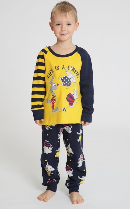 PYJAMA HAPPY PEOPLE GARÇON EN COTON CHAUD PULL "CIRCUS" MANCHES CONTRASTÉES, COL ROND. PANTALON BLEU À IMPRIMÉ ÉLÉPHANT