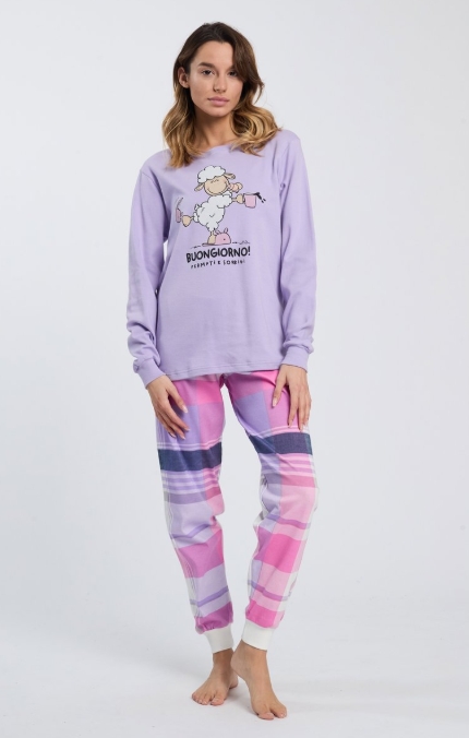 Découvrez notre pyjama Buongiorno col rond, 100 % coton pour un confort exceptionnel. Ce pyjama est parfait pour des nuits reposantes et des réveils paisibles. Sa coupe élégante et son design épuré en font le compagnon idéal pour tous vos moments de détente à la maison. Enveloppez-vous de douceur et de style chaque matin. Couleur lavande, haut uni et pantalon à carreaux. Composition : 100 % coton Saison automne-hiver