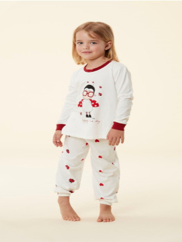 Happy People bimba. Pigiama girocollo, manica lunga e pantalone lungo, con polsino finale. Maglia colore bianco con disegno di pecorella vestita da coccinella. Pantalone colore bianco con cuoricini rossi. Composizione 100% cotone. Con fascetta per capelli. Stagione primavera estate.