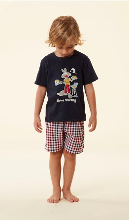 Happy People bimbo, pigiama completo corto. Maglia manica corta, apertura girocollo, colore blu notte, in tinta unita, con disegno sul davanti. Pantalone corto in tessuto di cotone, lunghezza fino sopra il ginocchio, a scacchetti colorati. Composizione 100% cotone. Stagione primavera estate.
