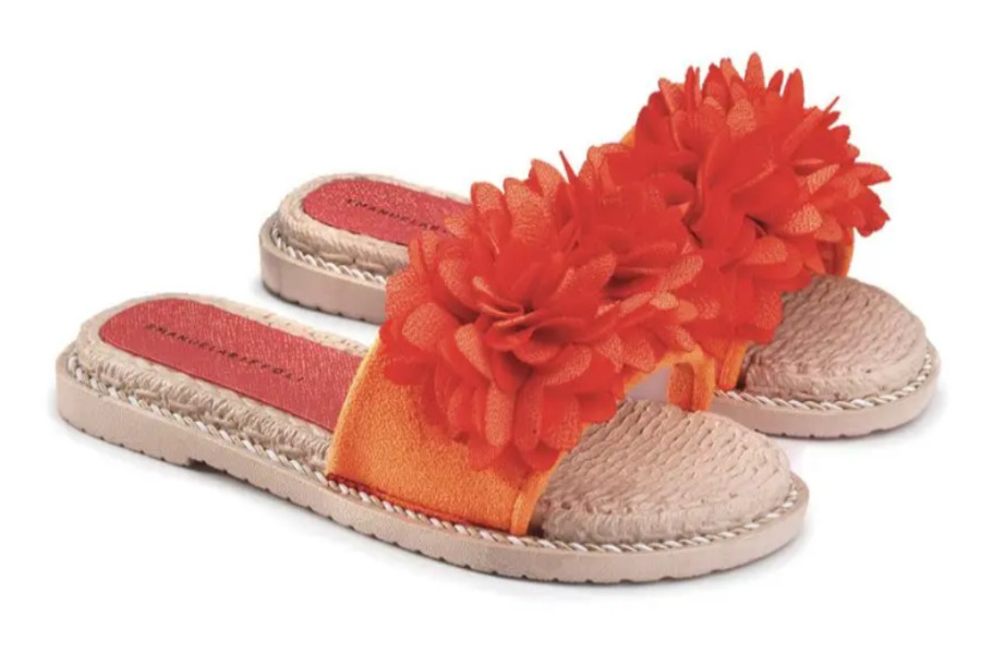 Biffoli-Hausschuhe mit dekorativen orangefarbenen Stoffblumen, Gummisohle mit Espadrille-Effekt.