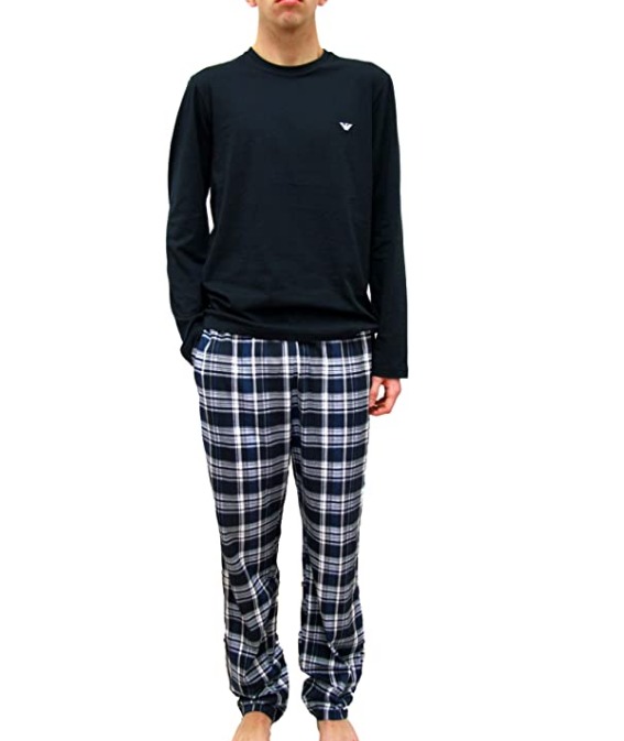 Pigiama completo uomo , con pantaloni, maglia girocollo manica lunga. T-shirt in tinta unita colore blu notte, con pantalone, in stampa scozzese. Logo aquila Emporio Armani ricamata sul lato sinistro della maglia. Abbigliamento da notte Composizione: 100%Cotone Chiusura: Pull On Stagione primavera estate