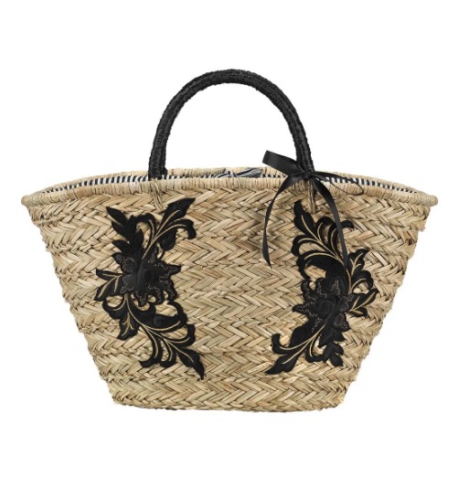 Paglia Damasco Tasche aus natürlichem Stroh mit dekorativen Patches vorne und Spitzenverschluss. Stofffutter mit Innentasche und satingefüttertem Griff.