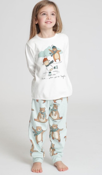 Pigiama bimba in caldo cotone, comodo e confortevole. Maglia colore bianco, con stampa centrale. Pantaloni colore verdi e stampa orsetti, polsini alle caviglie. Per riscaldare le fredde serate d'inverno. Stagione autunno-inverno Composizione: 100% cotone