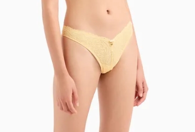 Brasiliana in pizzo realizzato con nylon riciclato certificato, a sostegno di una produzione circolare e a ridotto impatto ambientale. Fiocco a tono e medaglietta logata. Composizione 87% Poliammide 13% Elastan Il tessuto è costituito dal 56% di poliammide riciclata Pizzo Vita elastica Medaglietta logo