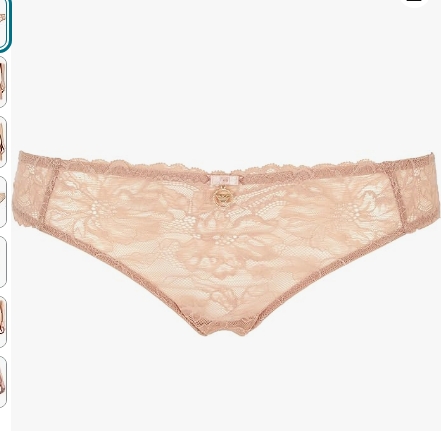Slip donna in elegante e raffinato pizzo colore nocciola, con medaglietta color oro logata.