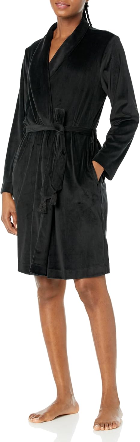 Offener Damen-Morgenmantel mit Schalkragen und Gürtelverschluss aus Webstoff in schwarzer Farbe. Logo mit goldener Medaille hinter dem Hals. Knielang. Materialzusammensetzung: 95 % Polyester, 5 % Elastan Waschanleitung: Handwäsche nur Herbst-Winter-Saison