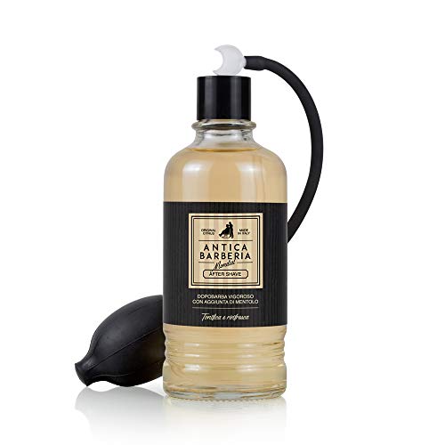Antica Barberia Mondial - Dopobarba "Vigoroso" . La formula di questo dopobarba, sulla base di pro-vitamina B5, ha un effetto idratante e rinfrescante, grazie all'aggiunta di Mentolo. Il dopobarba dona alla pelle lucentezza ed elasticità. Lenisce le irritazioni attraverso il suo effetto emostatico ed astringente. 400ml.