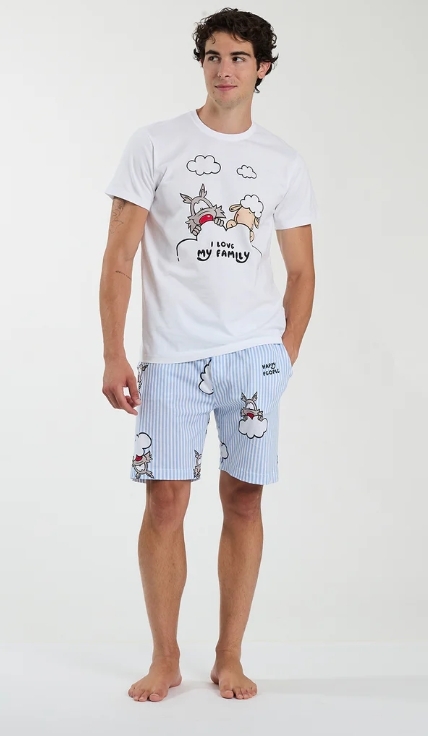 Un pigiama uomo in 100% cotone, pensato per offrire comfort e leggerezza nei momenti di riposo quotidiano. La t-shirt girocollo in tinta unita è arricchita dal disegno fantasia della linea Love My Family, mentre i pantaloni corti a righe azzurre riprendono il motivo grafico per un look coordinato e rilassato. La vestibilità comoda e il tessuto traspirante lo rendono ideale per la notte e per il tempo libero a casa